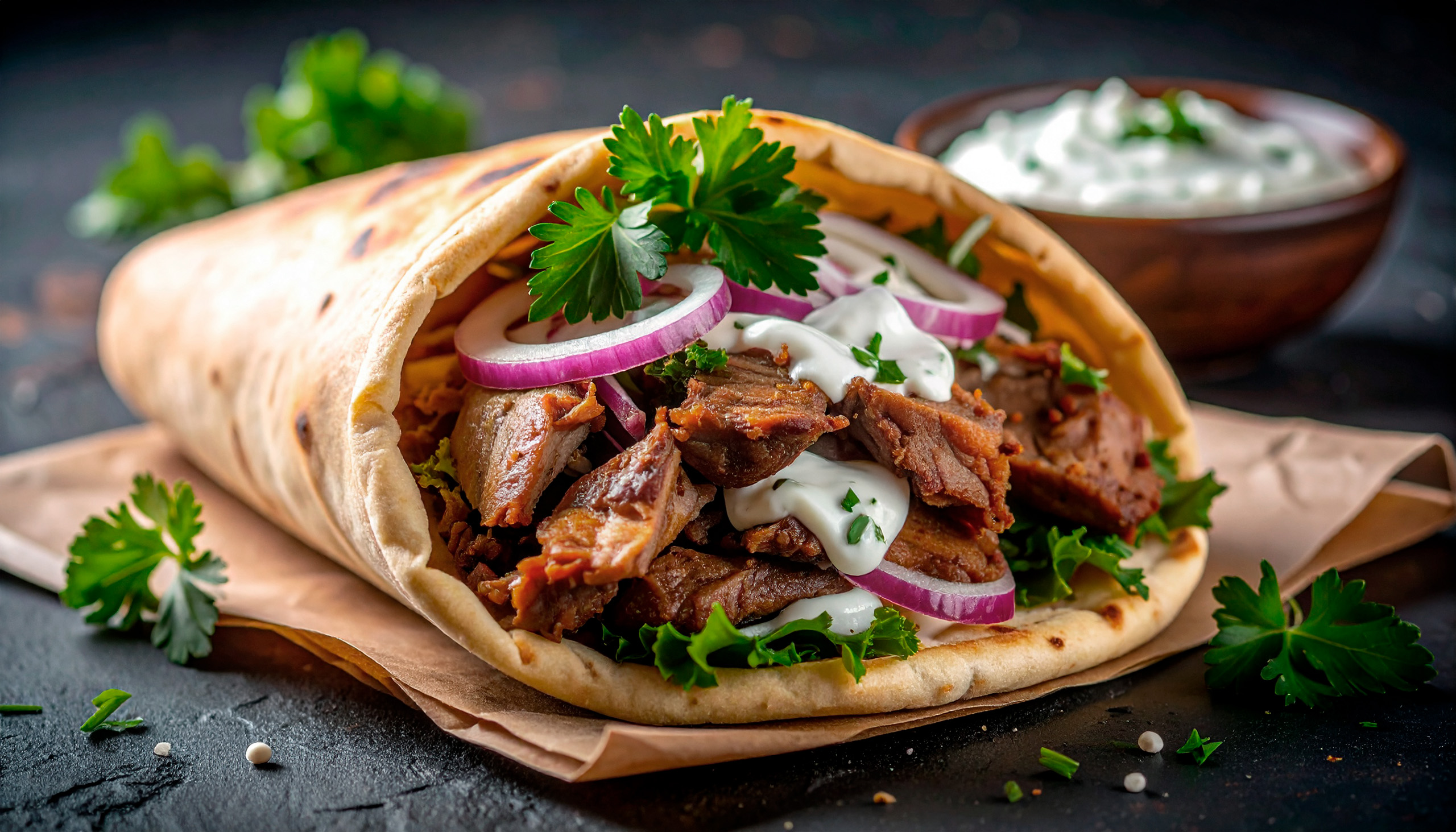 Een rijkelijk gevulde Griekse pitta met heerlijke gyros, koolsla, uitjes en tzatziki